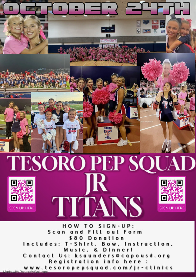 We are so excited to announce our 18th Annual Jr Titans Kids Clinic! This Clinic will be held before the Football game starting @ 3:45pm on October 24th. Please scan the QR Code on the flyer below with your Camera app to register. Registration includes a custom T-shirt, Bow, Instruction, Music, Dinner and cheering on the sidelines, as well as a special halftime performance! We cannot wait for this special event!!!